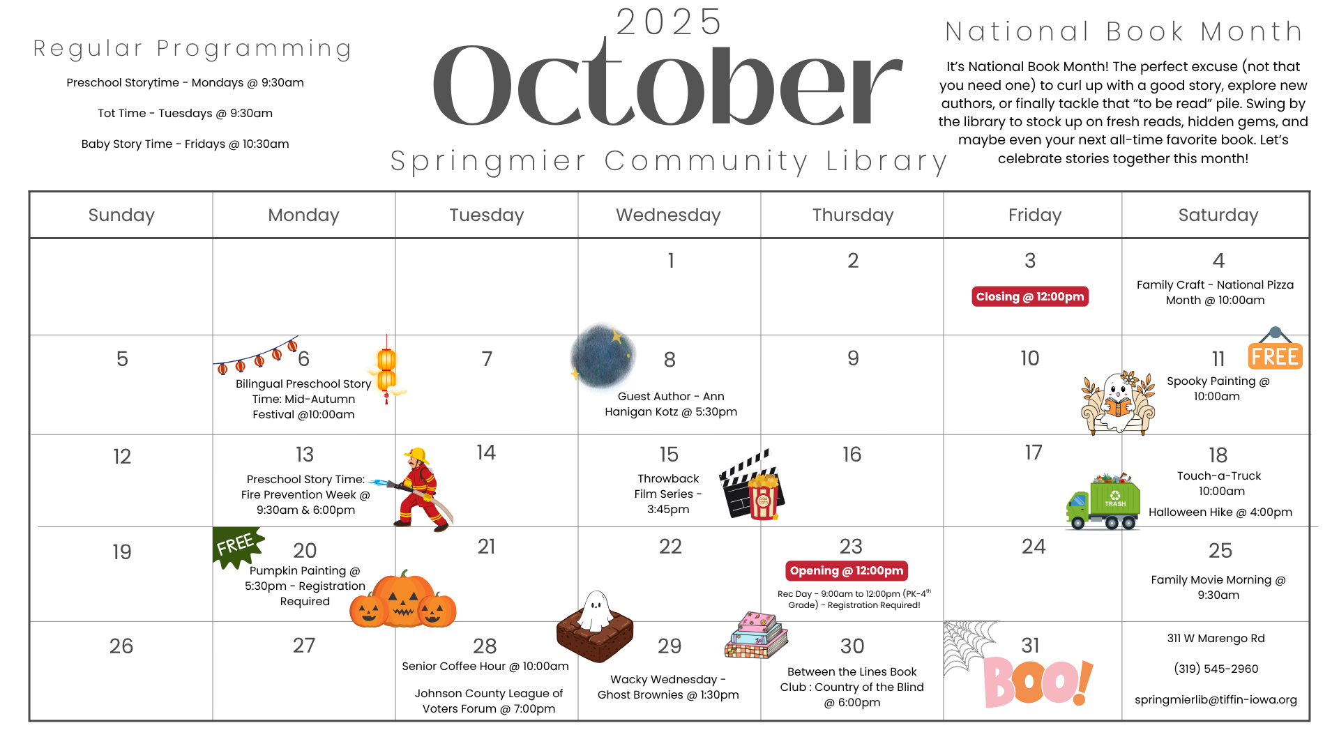 Welcome to the Springmier Community Library. The library is your one stop source for all of your informational needs. We have a large selection of books, magazines, and electronic resources available to be checked out by our library card holders. Here you will also find electronic resources, news, announcements, and a calendar of upcoming library events!