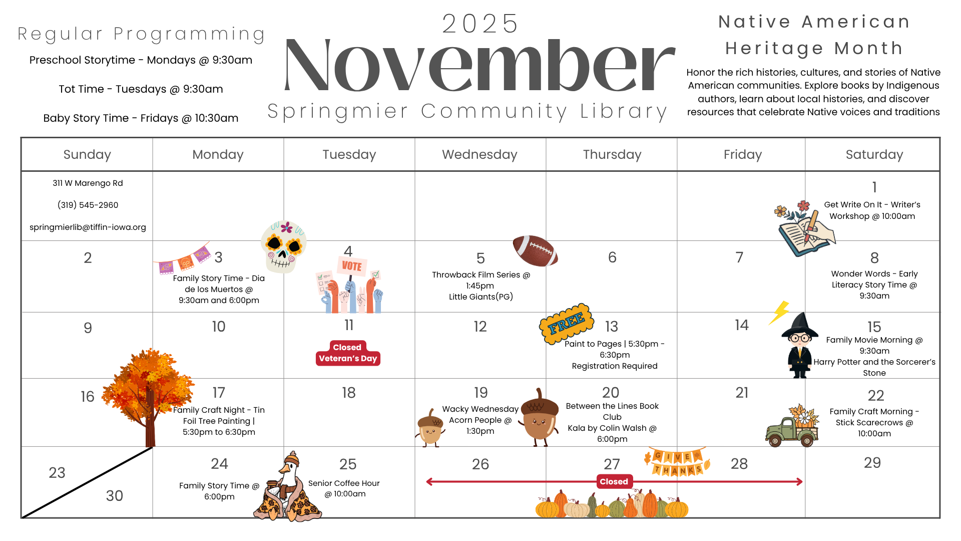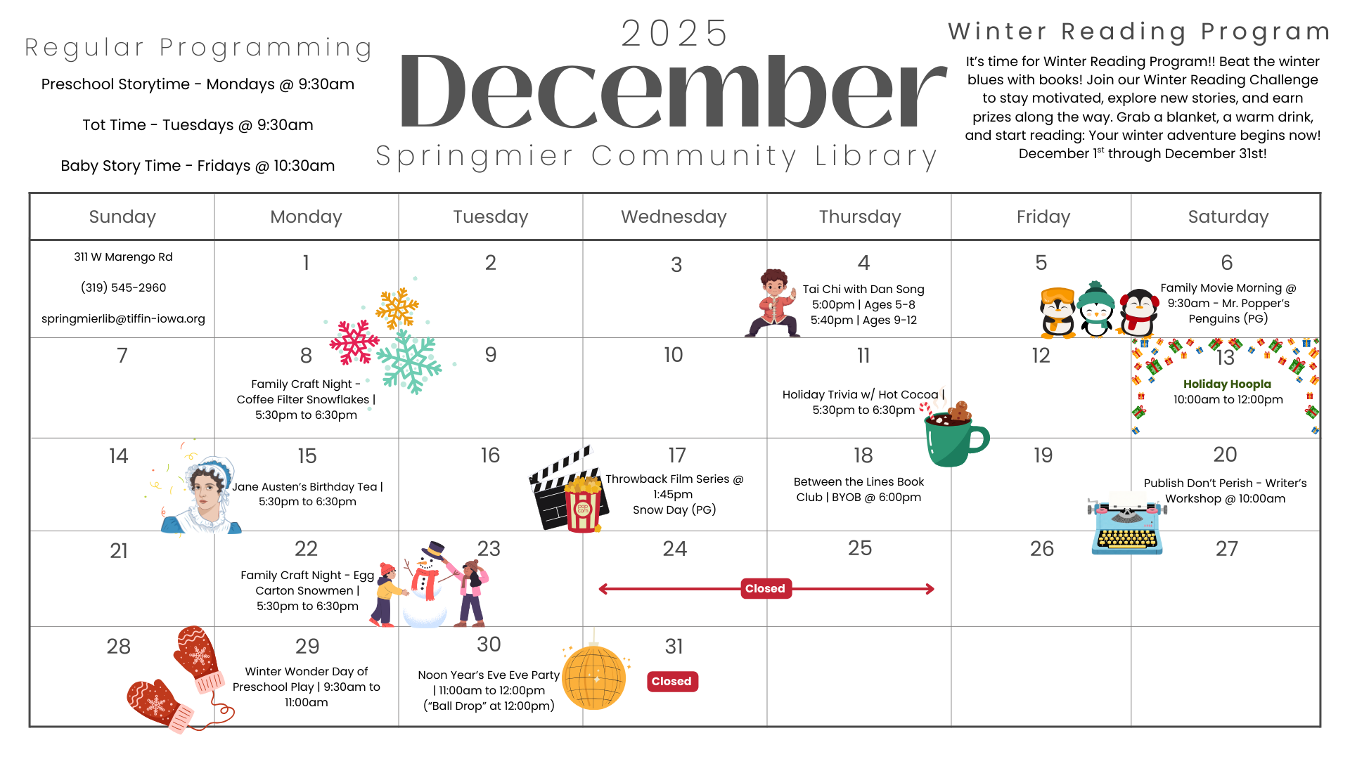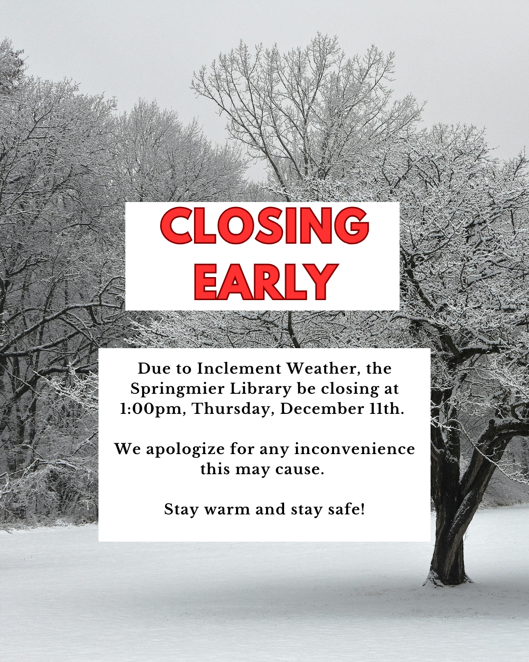 Welcome to the Springmier Community Library. The library is your one stop source for all of your informational needs. We have a large selection of books, magazines, and electronic resources available to be checked out by our library card holders. Here you will also find electronic resources, news, announcements, and a calendar of upcoming library events!
