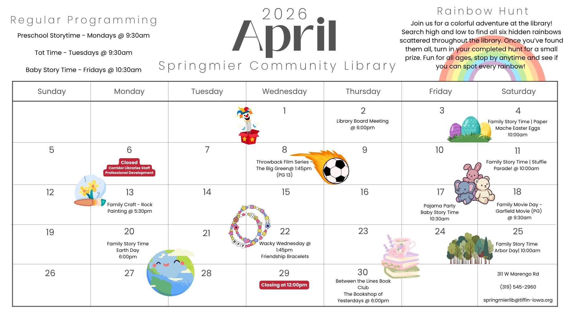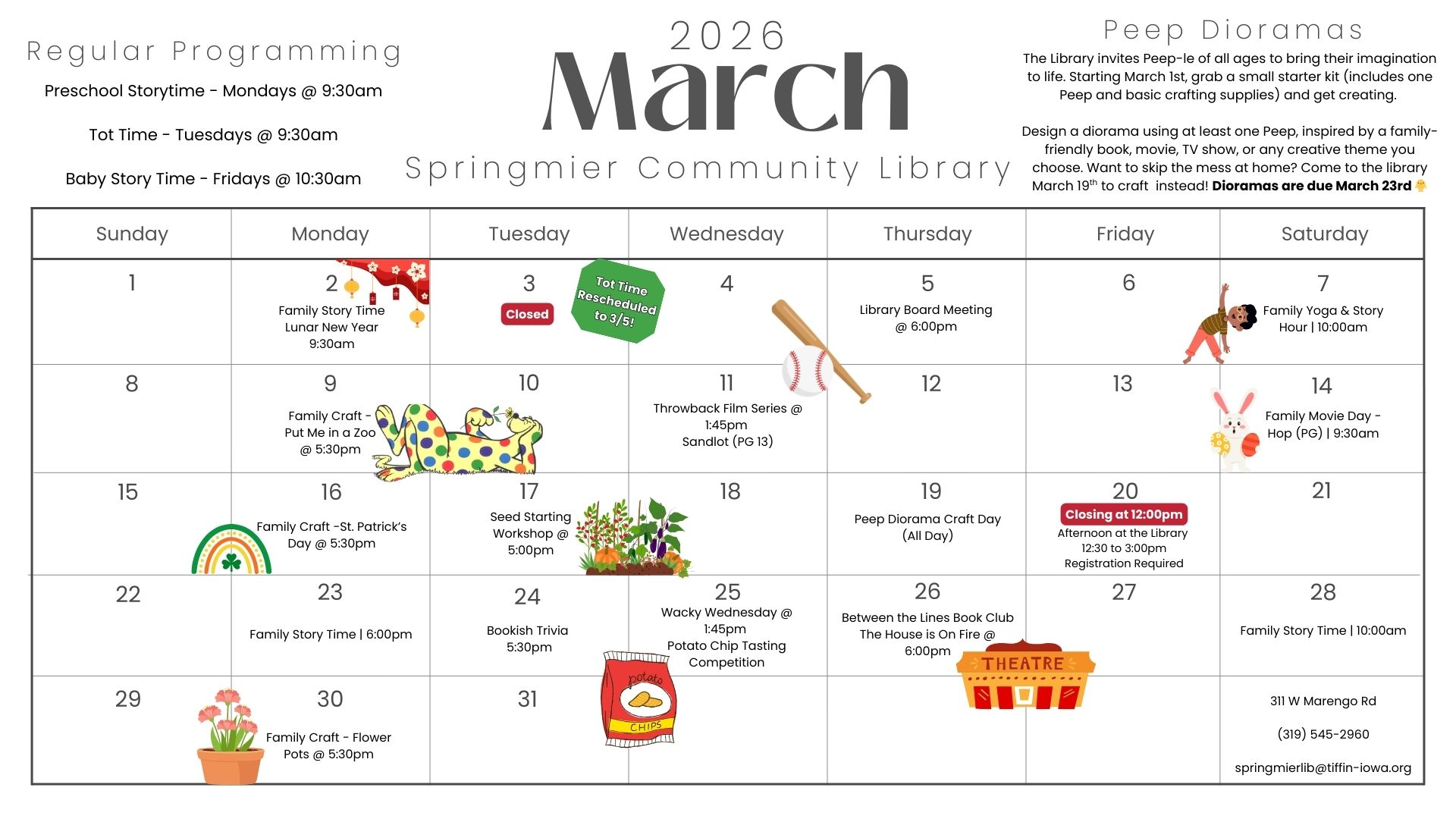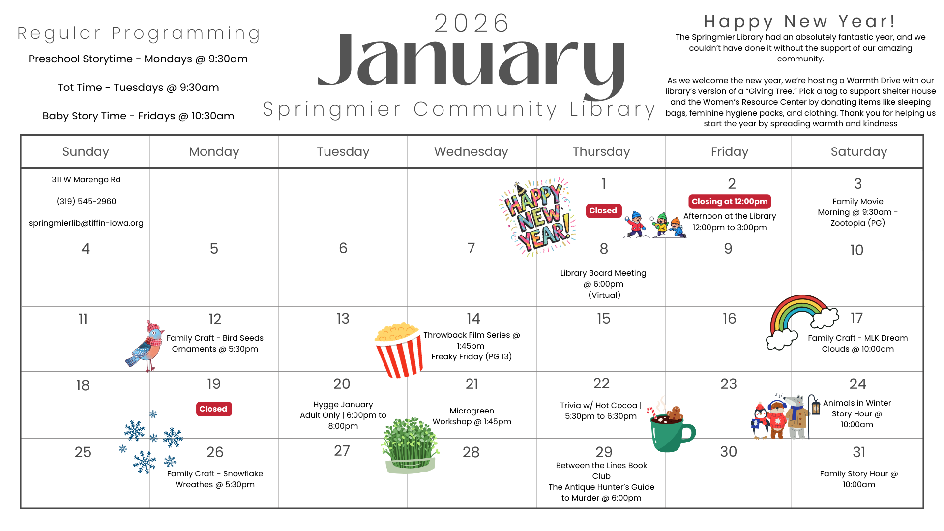 Welcome to the Springmier Community Library. The library is your one stop source for all of your informational needs. We have a large selection of books, magazines, and electronic resources available to be checked out by our library card holders. Here you will also find electronic resources, news, announcements, and a calendar of upcoming library events!